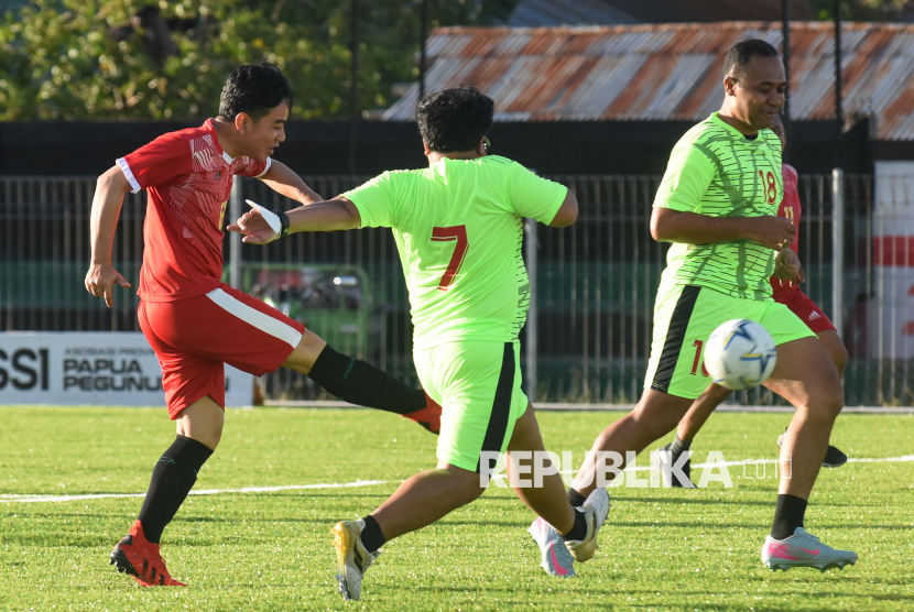 REPUBLIKA.CO.ID, WAMENA -- Wakil Presiden Gibran Rakabuming Raka menggiring bola saat bermain bersama anak-anak Sekolah Sepak Bola (SSB) di Stadion Lapangan Pendidikan Itlayikinia, Wamena, Papua Pegunungan, Selasa (13/1/2026).