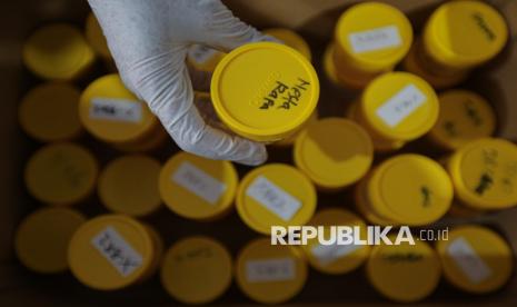 Botol sampel air liur siswa untuk diperiksa saat program skrining tuberkulosis (TBC) di SMK Yp Ippi Pejoto, Jakarta, Rabu (29/10/2025). Pengecekan tersebut meliputi pengambilan sampel air liur hingga pengecekan pernafasan menggunakan alat Smokerlyzer untuk mengukur paparan asap rokok pada paru-paru serta mengedukasi siswa terkait pencegahan dini penularan TBC. Berdasarkan data Pemprov DKI Jakarta hingga 22 Oktober 2025, tercatat sebanyak 46.308 kasus TB baru dari sekitar 68.000 orang yang menjalani skrining. Oleh karena itu. Pemprov DKI Jakarta menjadikan gerakan melawan TB sebagai prioritas utama untuk mencapai eliminasi TB pada tahun 2030. (FOTO : Republika/Thoudy Badai)