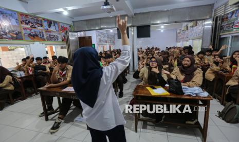 Petugas melakukan sosialisasi pencegahan TBC kepada siswa saat program skrining tuberkulosis (TBC) di SMK Yp Ippi Pejoto, Jakarta, Rabu (29/10/2025). Pengecekan tersebut meliputi pengambilan sampel air liur hingga pengecekan pernafasan menggunakan alat Smokerlyzer untuk mengukur paparan asap rokok pada paru-paru serta mengedukasi siswa terkait pencegahan dini penularan TBC. Berdasarkan data Pemprov DKI Jakarta hingga 22 Oktober 2025, tercatat sebanyak 46.308 kasus TB baru dari sekitar 68.000 orang yang menjalani skrining. Oleh karena itu. Pemprov DKI Jakarta menjadikan gerakan melawan TB sebagai prioritas utama untuk mencapai eliminasi TB pada tahun 2030. (FOTO : Republika/Thoudy Badai)