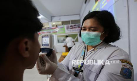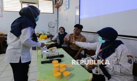 Petugas mengambil sampel air liur siswa untuk pengecekan kesehatan saat program skrining tuberkulosis (TBC) di SMK Yp Ippi Pejoto, Jakarta, Rabu (29/10/2025). Pengecekan tersebut meliputi pengambilan sampel air liur hingga pengecekan pernafasan menggunakan alat Smokerlyzer untuk mengukur paparan asap rokok pada paru-paru serta mengedukasi siswa terkait pencegahan dini penularan TBC. Berdasarkan data Pemprov DKI Jakarta hingga 22 Oktober 2025, tercatat sebanyak 46.308 kasus TB baru dari sekitar 68.000 orang yang menjalani skrining. Oleh karena itu. Pemprov DKI Jakarta menjadikan gerakan melawan TB sebagai prioritas utama untuk mencapai eliminasi TB pada tahun 2030. (FOTO : Republika/Thoudy Badai)