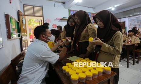 Siswa mengambil sampel air liur saat pemeriksaan kesehatan saat program skrining tuberkulosis (TBC) di SMK Yp Ippi Pejoto, Jakarta, Rabu (29/10/2025). Pengecekan tersebut meliputi pengambilan sampel air liur hingga pengecekan pernafasan menggunakan alat Smokerlyzer untuk mengukur paparan asap rokok pada paru-paru serta mengedukasi siswa terkait pencegahan dini penularan TBC. Berdasarkan data Pemprov DKI Jakarta hingga 22 Oktober 2025, tercatat sebanyak 46.308 kasus TB baru dari sekitar 68.000 orang yang menjalani skrining. Oleh karena itu. Pemprov DKI Jakarta menjadikan gerakan melawan TB sebagai prioritas utama untuk mencapai eliminasi TB pada tahun 2030. (FOTO : Republika/Thoudy Badai)