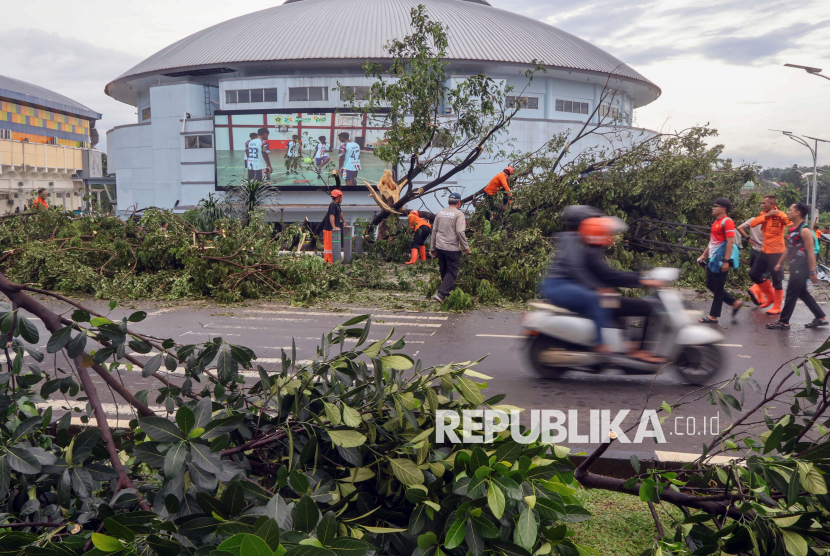 Petugas gabungan mengevakuasi pohon tumbang di Pakansari, Kabupaten Bogor, Jawa Barat, Kamis (12/2/2026). Menurut BPBD Kabupaten Bogor hujan deras disertai angin kencang mengakibatkan sejumlah pohon di wilayah Pakansari tersebut tumbang sehingga menyebabkan satu orang luka serta menyebabkan kemacetan lalu lintas. (FOTO : ANTARA FOTO/Yulius Satria Wijaya)