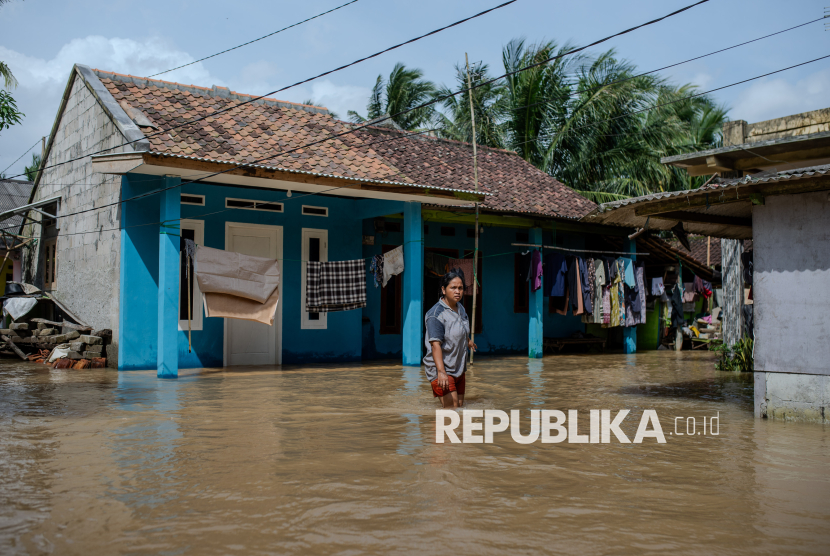 Warga bejalan di depan rumahnya yang masih terendam banjir di Kampung Nusa, Jawilan, Kabupaten Serang, Banten, Sabtu (24/1/2026). Banjir akibat luapan sungai Cibereum dengan ketinggian air mencapai 1,5 meter yang terjadi sejak Rabu (21/1) tersebut memutus akses jalan utama sepanjang satu kilometer sehingga kampung tersebut terisolasi. (FOTO : ANTARA FOTO/Muhammad Bagus Khoirunas)