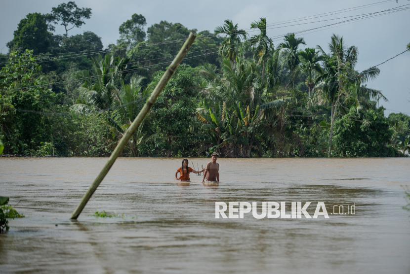 Warga menerobos banjir di Kampung Nusa, Jawilan, Kabupaten Serang, Banten, Sabtu (24/1/2026). Banjir akibat luapan sungai Cibereum dengan ketinggian air mencapai 1,5 meter yang terjadi sejak Rabu (21/1) tersebut memutus akses jalan utama sepanjang satu kilometer sehingga kampung tersebut terisolasi. (FOTO : ANTARA FOTO/Muhammad Bagus Khoirunas)