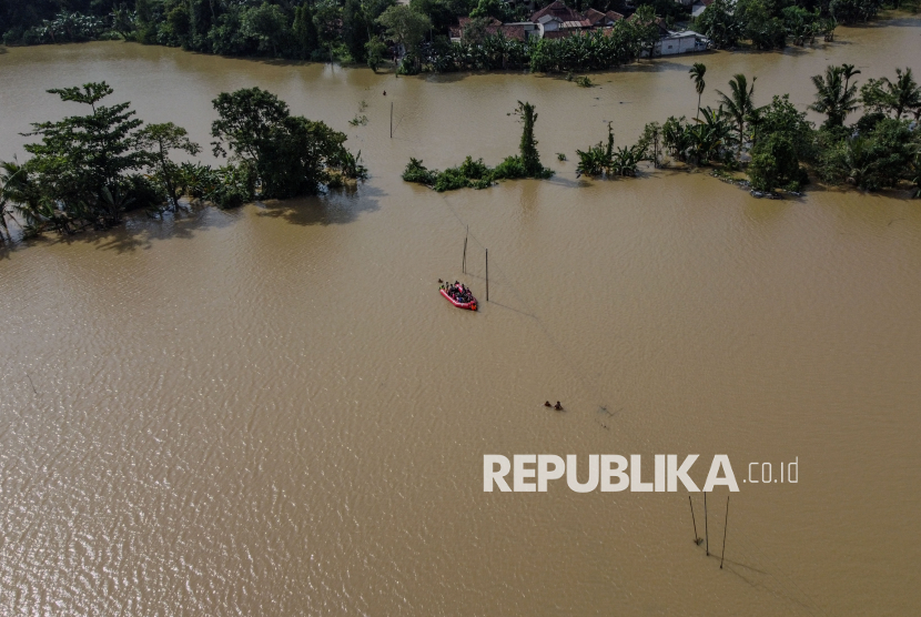 REPUBLIKA.CO.ID, SERANG -- Warga menaiki perahu karet menyeberangi banjir di Kampung Nusa, Jawilan, Kabupaten Serang, Banten, Sabtu (24/1/2026).