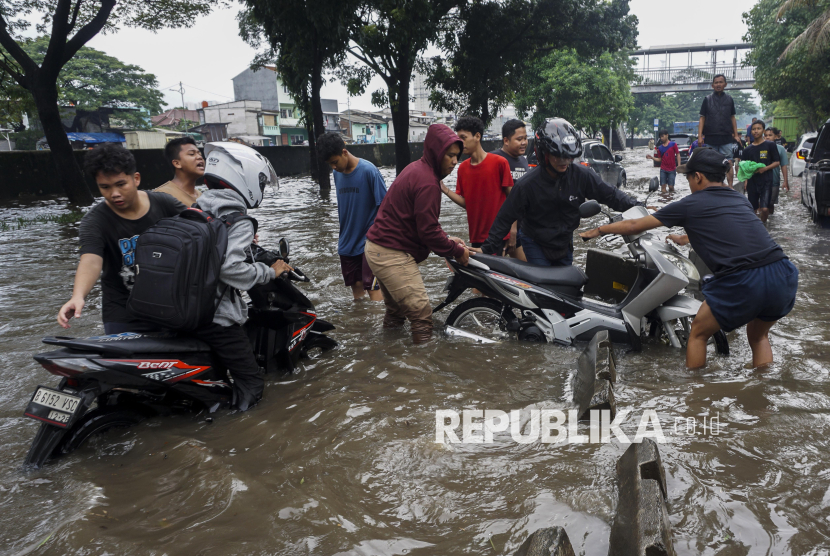 Warga membantu pengendara sepeda motor yang mogok saat menerobos banjir di Jalan Daan Mogot, Jakarta, Kamis (22/1/2026). Banjir setinggi 50-60 cm akibat hujan berintensitas tinggi serta buruknya sistem drainase tersebut membuat sejumlah kendaraan mogok dan lalu lintas terganggu. (FOTO : ANTARA FOTO/Ika Maryani)