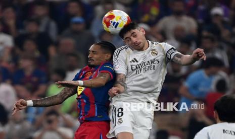Pemain Real Madrid Federico Valverde berduel udara dengan pemain Barcelona Raphinha pada pertandingan final Piala Super Spanyol antara FC Barcelona dan Real Madrid di Jeddah, Arab Saudi, Ahad (11/1/2026). Real Madrid hanya mampu mencetak gol lewat Vinicius Junior di menit 47 dan Gonzalo Garcia Torres pada menit ke-52. (FOTO : EPA)
