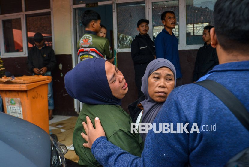 Keluarga korban bencana tanah longsor menangis saat menunggu proses identifikasi korban di Desa Pasirlangu, Cisarua, Kabupaten Bandung Barat, Jawa Barat, Ahad (25/1/2026). Berdasarkan hasil asesmen tim SAR gabungan hingga Ahad (25/1) pukul 10.00 WIB, sebanyak 11 orang ditemukan meninggal dunia, dan 79 lainnya masih dalam pencarian. (FOTO : EPA/KHAIRIZAL MARIS)
