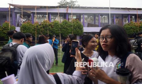Sejumlah siswa melihat bangunan SMAN 2 Gunungputri yang ambruk di Kabupaten Bogor, Jawa Barat, Jumat (23/1/2026). Menurut keterangan BPBD Kabupaten Bogor tiga ruang kelas SMAN 2 Gunungputri atapnya ambruk diduga akibat konstruksi baja ringan penahan genteng yang tidak kokoh dan tidak kuat menahan beban genteng saat terjadi hujan lebat dari malam hingga pagi hari, kejadian tersebut tidak menimbulkan korban jiwa. (FOTO : ANTARA FOTO/Yulius Satria Wijaya)