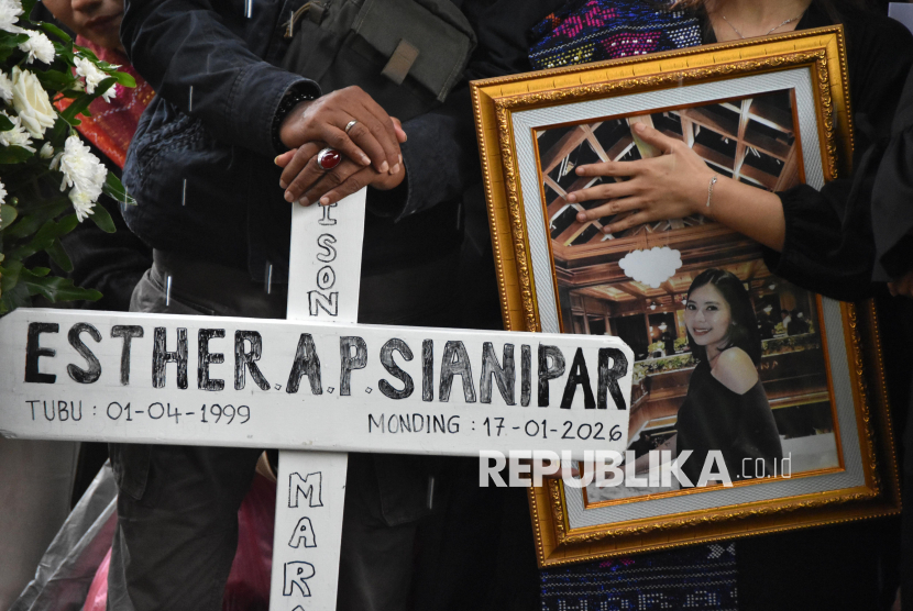 Keluarga membawa foto korban pesawat ATR 42-500 Esther Aprilita P. Sianipar saat prosesi pemakaman di TPU Gunung Gadung, Kelurahan Genteng, Kota Bogor, Jawa Barat, Sabtu (24/1/2026). Esther merupakan salah satu pramugari yang menjadi korban kecelakaan pesawat ATR 42-500 di kawasan Gunung Bulusaraung, Kabupaten Pangkep, Sulawesi Selatan. (FOTO : ANTARA FOTO/Arif Firmansyah)