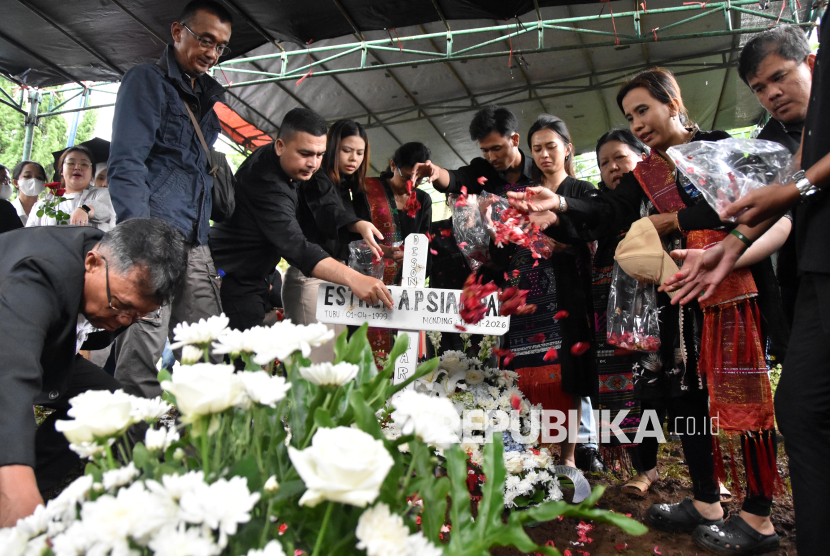 REPUBLIKA.CO.ID, BOGOR -- Kerabat menangis saat mengikuti prosesi pemakaman korban pesawat ATR 42-500 Esther Aprilita P. Sianipar di TPU Gunung Gadung, Kelurahan Genteng, Kota Bogor, Jawa Barat, Sabtu (24/1/2026).