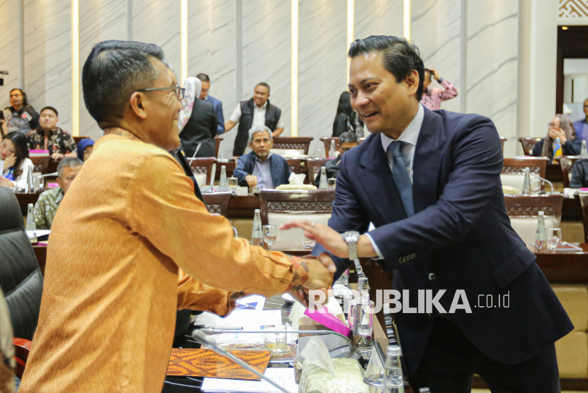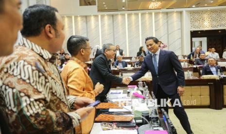 Calon Deputi Gubernur Bank Indonesia (BI) yang juga Wakil Menteri Keuangan Thomas Djiwandono (kanan) menyapa pimpinan Komisi XI DPR RI saat akan mengikuti uji kelayakan dan kepatutan atau fit and proper test calon Deputi Gubernur Bank Indonesia di ruang Komisi XI DPR, Kompleks Parlemen, Senayan, Jakarta, Senin (26/1/2026). Thomas Djiwandono merupakan satu dari tiga nama calon Deputi Gubernur BI yang diusulkan Presiden Prabowo Subianto, melalui surat Presiden yang dikirim ke DPR RI. (FOTO : Republika/Thoudy Badai)