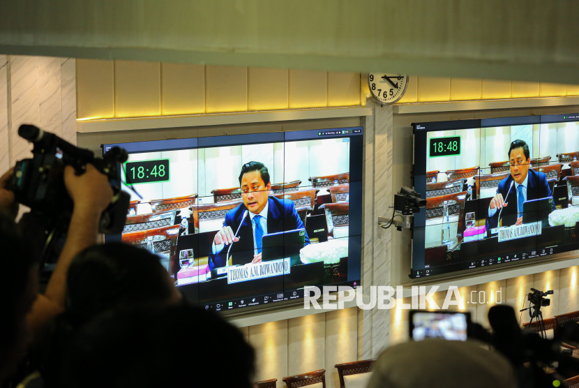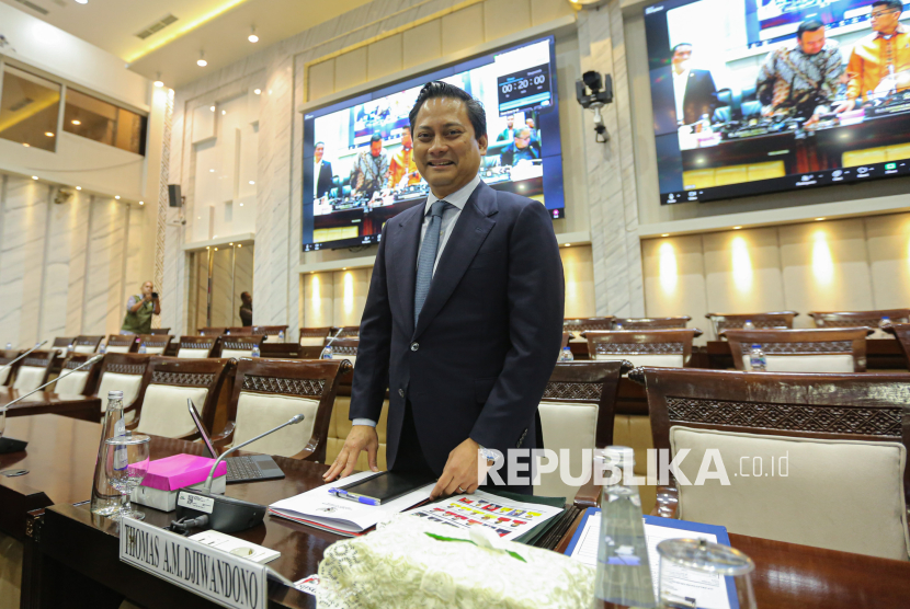 Calon Deputi Gubernur Bank Indonesia (BI) yang juga Wakil Menteri Keuangan Thomas Djiwandono mengikuti uji kelayakan dan kepatutan atau fit and proper test calon Deputi Gubernur Bank Indonesia di ruang Komisi XI DPR, Kompleks Parlemen, Senayan, Jakarta, Senin (26/1/2026). Thomas Djiwandono merupakan satu dari tiga nama calon Deputi Gubernur BI yang diusulkan Presiden Prabowo Subianto, melalui surat Presiden yang dikirim ke DPR RI. (FOTO : Republika/Thoudy Badai)