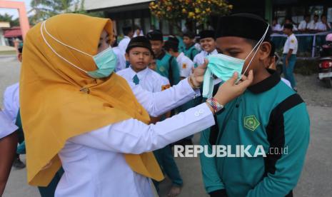 Petugas medis dari Pukesmas Samatiga membantu memakaikan masker kepada pelajar di Madrasah Tsanawiyah Negeri (MTsN) Blang Bale, Kecamatan Samatiga, Aceh Barat, Aceh, Selasa (27/1/2026). Sebanyak 600 masker dibagikan kepada siswa-siswi untuk mengantisipasi penyakit Infeksi Saluran Pernafasan Akut (ISPA) seiring semakin tebalnya kabut asap dampak Kebakaran Hutan dan Lahan (Karhutla) yang terus meluas di Kabupaten setempat. (FOTO : ANTARA FOTO/Syifa Yulinnas)