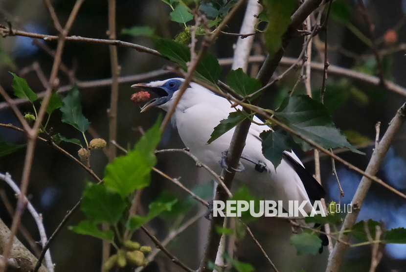 Seekor burung Curik Bali (Leucopsar rothschildi) memakan buah murbei saat pelepasliaran di Desa Adat Karang Dalem Tua, Badung, Bali, Kamis (9/4/2026). Balai Konservasi Sumber Daya Alam (BKSDA) Provinsi Bali melepasliarkan 12 burung Curik Bali atau Jalak Bali sebagai konservasi habitat dan pemulihan populasi. (FOTO : ANTARA FOTO/Nyoman Hendra Wibowo)