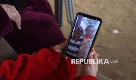 Malak Khader melihat foto keluarganya yang syahid akibat serangan Israel di tempat penampungan sementara di sebelah timur Kota Gaza. Serangan militer Israel menewaskan semua anggota keluarga inti Malak. Malak menjadi satu-satunya korban yang selamat dari keluarganya. (FOTO : Rizek Abdeljawad/Xinhua)