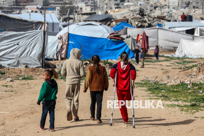 Malak Khader (kiri) bermain dengan temannya di tempat penampungan sementara di sebelah timur Kota Gaza. Kaki sebelah kanan Malak terpaksa diamputasi sebagai upaya medis untuk menyelamatkan nyawanya. (FOTO : Rizek Abdeljawad/Xinhua)