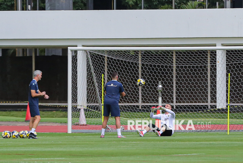 Penjaga gawang Timnas Indonesia Maarten Paes saat sesi latihan di Stadion Madya, Kompleks Stadion Utama Gelora Bung Karno (SUGBK), Jakarta, Selasa (24/3/2026). Latihan tersebut digelar untuk mempersiapkan pertandingan dalam laga FIFA Series 2026 yang mempertemukan antara Timnas Indonesia, Bulgaria, Saint Kitts and Nevis dan Kepulauan Solomon. Latihan tersebut diikuti oleh 15 pemain dengan komposisi 10 pemain lokal dan lima pemain abroad diantaranya Elkan Baggott, Ole Romeny, Sandy Walsh, Ramadhan Sananta dan Maarten Paes. (FOTO : Republika/Thoudy Badai)