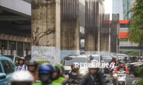 Pembangunan tiang monorel di Rasuna Said dimulai pada 2004 dan diresmikan langsung oleh Presiden Megawati Soekarnoputri sebagai solusi kemacetan. Namun, proyek itu terhenti pada 2007 akibat persoalan pendanaan dan aset lalu meninggalkan deretan tiang beton mangkrak selama hampir dua dekade. (FOTO : Republika/Prayogi)