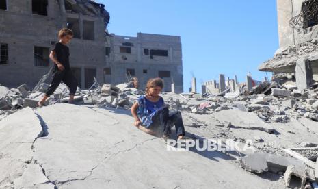 Anak-anak bermain di reruntuhan bangunan yang hancur akibat serangan Israel, di Kota Gaza, Ahad (26/10/2025). Pasca gencatan senjata, warga Gaza kembali ke rumah mereka yang hancur. Data satelit PBB (UNOSAT) pada Desember 2024, diperkirakan 245.123 unit rumah hancur akibat serangan Israel. Pembangunan kembali rumah-rumah yang hancur di Gaza akan memakan waktu setidaknya hingga 2040, dan kemungkinan akan berlangsung selama beberapa dekade. (FOTO : REUTERS/Ebrahim Hajjaj)