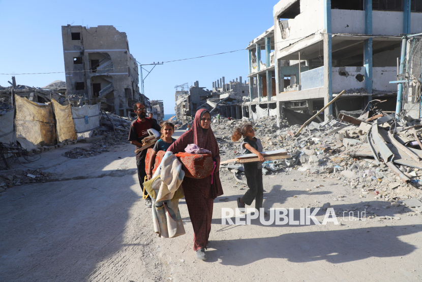 Warga Palestina, Amal Alyan bersama keluarganya berjalan di lingkungan rumah mereka yang hancur akibat serangan Israel, di Kota Gaza, Ahad (26/10/2025). Pasca gencatan senjata, warga Gaza kembali ke rumah mereka yang hancur. Data satelit PBB (UNOSAT) pada Desember 2024, diperkirakan 245.123 unit rumah hancur akibat serangan Israel. Pembangunan kembali rumah-rumah yang hancur di Gaza akan memakan waktu setidaknya hingga 2040, dan kemungkinan akan berlangsung selama beberapa dekade. (FOTO : REUTERS/Ebrahim Hajjaj)