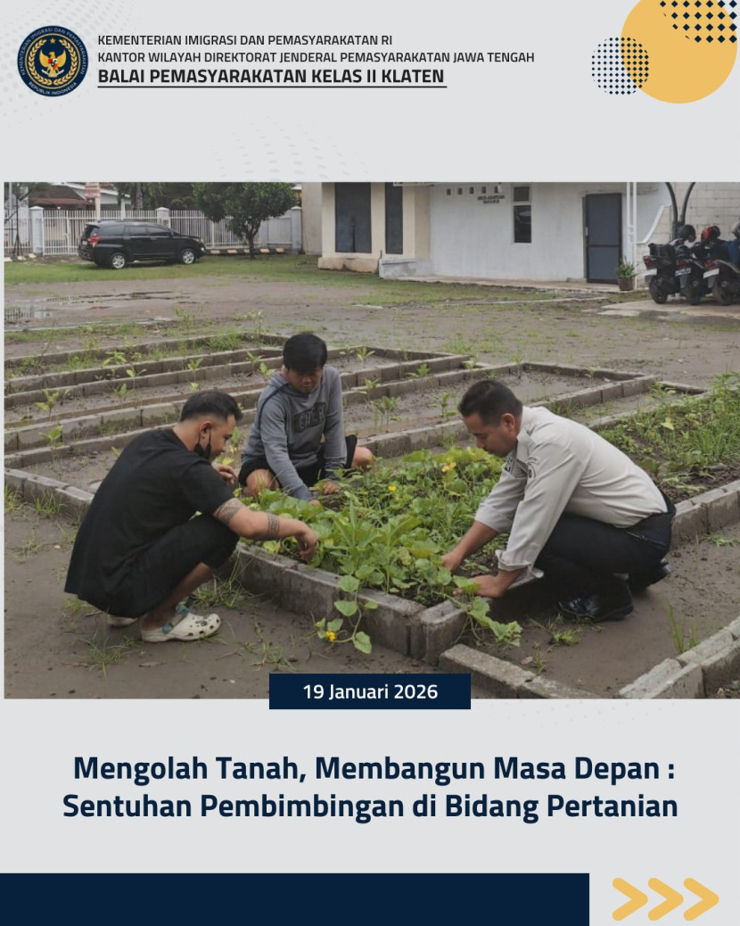 Pada hari Rabu, 21 Januari 2026, Pembimbing Kemasyarakatan melaksanakan kegiatan Bimbingan Kemandirian Bidang Pertanian kepada Klien Pemasyarakatan sebagai bagian dari upaya pembinaan dan pemberdayaan klien agar memiliki keterampilan yang bermanfaat bagi masa depan mereka.