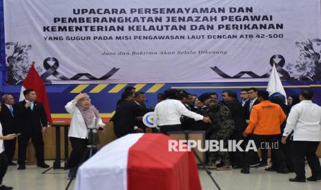 REPUBLIKA.CO.ID, JAKARTA -- Menteri Kelautan dan Perikanan Sakti Wahyu Trenggono dibopong petugas setelah jatuh pingsan saat memimpin upacara penghormatan dan pelepasan tiga jenazah pegawai Kementerian Kelautan dan Perikanan (KKP) korban kecelakaan pesawat ATR 42-500 di Politeknik AUP Jakarta, Ahad (25/1/2026).