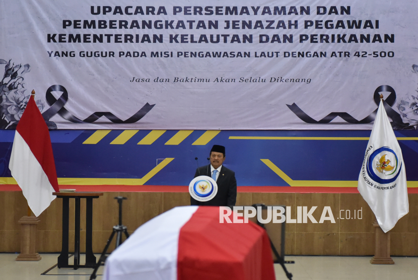 Menteri KP Sakti Wahyu Trenggono memimpin upacara penghormatan dan pelepasan 3 jenazah pegawai KKP korban kecelakaan pesawat ATR 42-500 di Politknik AUP Jakarta, Ahad (25/1/2026). KKP menggelar upacara penghormatan dan pelepasan jenazah pilot pesawat ATR 42-500 Kapten Andy Dahananto korban kecelakaan udara di Gunung Bulusaraung, Kabupaten Maros. Upacara itu juga untuk dua pegawai KKP lainnya, yakni almarhum Ferry Irawan dan almarhum Yoga Naufal. (FOTO : ANTARA FOTO/Muhammad Iqbal)
