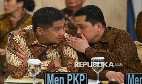 Menpora Erick Thohir (kanan) dan Menteri Perumahan dan Kawasan Permukiman (PKP) Maruarar Sirait (kiri) berbincang sebelum Sidang Kabinet Paripurna di Istana Negara, Jakarta, Senin (20/10/2025). Sidang kabinet paripurna yang bertepatan dengan setahun masa pemerintahan Presiden Prabowo dan Wapres Gibran tersebut membahas realisasi pada 2025 dan rencana kerja pada 2026 terkait program kerja Kabinet Merah Putih di sejumlah bidang, dari ekonomi, bidang pangan, energi, pemberantasan kemiskinan, hingga pembangunan SDM. (FOTO : ANTARA FOTO/Aditya Pradana Putra)