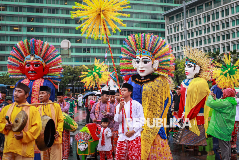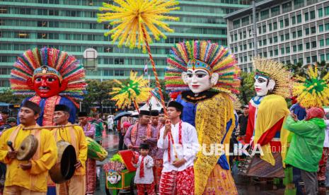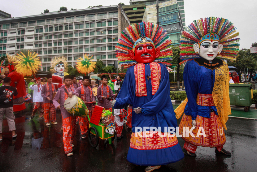 Parade ondel-ondel tampil dalam rangkaian Jakarta Penuh Warna saat Hari Bebas Kendaraan Bermotor (HBKB) di kawasan Bundaran HI, Jakarta, Ahad (8/2/2026). Kegiatan tersebut digelar sebagai kampanye untuk mengajak warga menjaga lingkungan kota dan memperkuat rasa kebersamaan antar warga Jakarta. (FOTO : ANTARA FOTO/Reno Esnir)