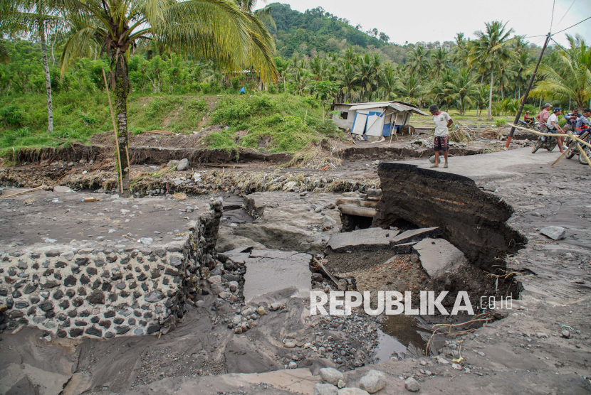 Warga melihat kondisi jalan yang rusak akibat diterjang aliran lahar hujan di Desa Gondoruso, Lumajang, Jawa Timur, Kamis (6/11/2025). Pemerintah Kabupaten Lumajang melalui instansi terkait melakukan normalisasi jalur aliran lahar hujan, membangun tanggul darurat, serta memperpanjang status tanggap darurat bencana pada 8–14 November. (FOTO : ANTARA FOTO/Irfan Sumanjaya)