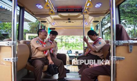 Empat siswa penyandang disabilitas menaiki bus sekolah ramah disabilitas saat peluncuran armada tersebut di Pendopo Balai Kota, Jakarta, Rabu (21/1/2026). Pemerintah Provinsi DKI Jakarta meluncurkan 32 bus layanan angkutan sekolah ramah disabilitas di tahun 2026 yang akan melayani hingga 41ribu siswa di Jakarta. (FOTO : ANTARA FOTO/Indrianto Eko Suwarso)