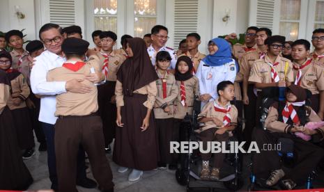 Gubernur DKI Jakarta Pramono Anung (kiri) memeluk siswa penyandang disabilitas saat peluncuran layanan angkutan sekolah ramah disabilitas tahun 2026 di Pendopo Balai Kota, Jakarta, Rabu (21/1/2026). Pemerintah Provinsi DKI Jakarta meluncurkan 32 bus layanan angkutan sekolah ramah disabilitas di tahun 2026 yang akan melayani hingga 41ribu siswa di Jakarta. (FOTO : ANTARA FOTO/Indrianto Eko Suwarso)