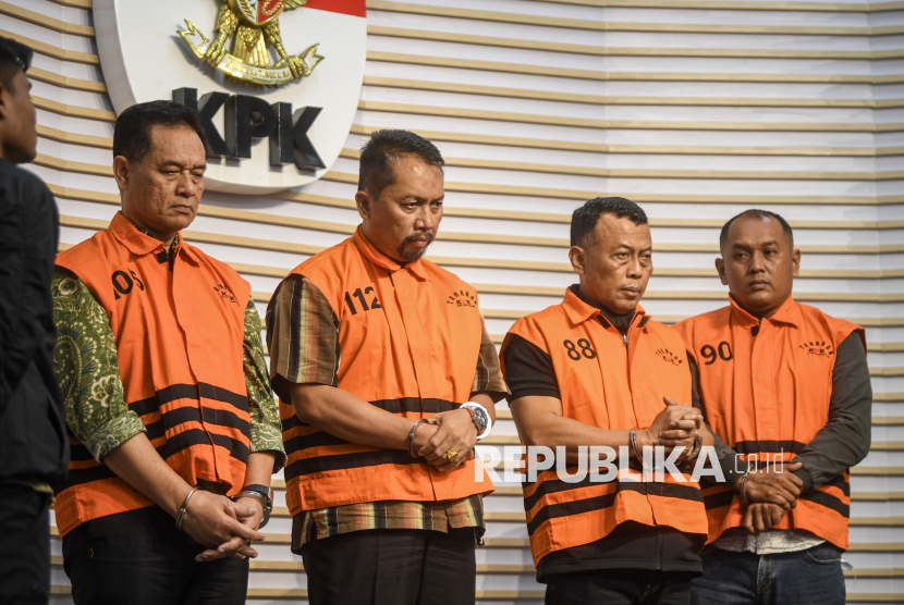 Para tersangka yakni Bupati Ponorogo Sugiri Sancoko (kedua kanan) bersama Sekda Kabupaten Ponorogo Agus Pramono (kedua kiri), Direktur RSUD Dokter Harjono Ponorogo Yunus Mahatma (kiri) dan pihak swasta Sucipto (kanan) dihadirkan dalam konferensi pers di gedung Merah Putih KPK, Jakarta, Ahad (9/11/2025). Dari hasil operasi tangkap tangan, KPK menetapkan dan menahan Bupati Ponorogo Sugiri Sancoko, Sekda Agus Pramono, Direktur RSUD Harjono Kabupaten Ponorogo Yunus Mahatma, dan pihak swasta Sucipto sebagai tersangka terkait kasus dugaan suap pengurusan jabatan, dugaan suap proyek pekerjaan di RSUD Ponorogo dan gratifikasi di lingkungan Pemerintah Kabupaten Ponorogo. (FOTO : ANTARA FOTO/Muhammad Adimaja)