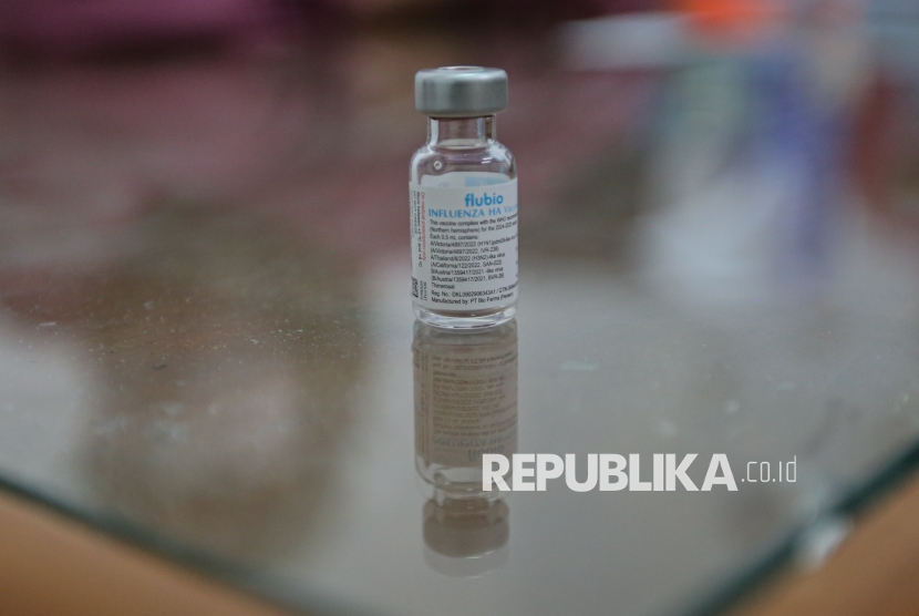 Dokter menunjukan cairan vaksin influenza Flubio. Gejala superflu umumnya menyerupai flu biasa, namun cenderung lebih berat dan muncul secara mendadak. Warga yang terinfeksi biasanya mengalami demam tinggi disertai menggigil, batuk berkepanjangan, sakit tenggorokan, serta pilek atau hidung tersumbat. (FOTO : Republika/Thoudy Badai)
