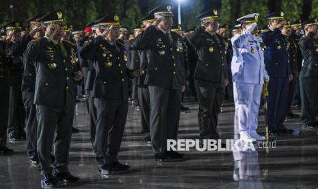 Panglima TNI Jenderal TNI Agus Subiyanto (kiri) bersama Kapolri Jenderal Pol. Listyo Sigit Prabowo (kedua kiri), Wakil Panglima TNI Jenderal TNI Tandyo Budi Revita (ketiga kiri), Kepala Staf Angkatan Darat (Kasad) Jenderal TNI Maruli Simanjuntak (ketiga kanan), Kasal Laksamana TNI Muhammad Ali (kedua kanan), Kepala Staf Angkatan Udara (Kasau) Marsekal TNI Mohamad Tonny Harjono (kanan) mengikuti Upacara Ziarah Nasional dan Renungan Suci Hari Pahlawan 2025 di Taman Makam Pahlawan Nasional Utama Kalibata, Jakarta, Ahad (9/11/2025). Kegiatan yang digelar sebagai rangkaian peringatan Hari Pahlawan 2025 tersebut mengusung tema Pahlawanku Teladanku, Terus Bergerak, Melanjutkan Perjuangan. (FOTO : ANTARA FOTO/Galih Pradipta)