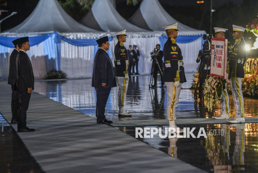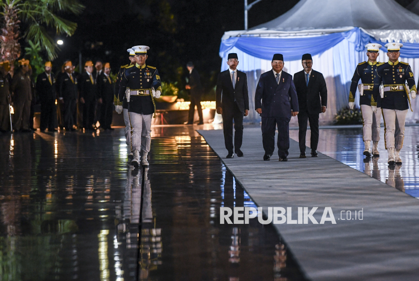 REPUBLIKA.CO.ID, JAKARTA -- Presiden Prabowo Subianto didampingi Wakil Presiden Gibran Rakabuming Raka memimpin Upacara Ziarah Nasional dan Renungan Suci Hari Pahlawan 2025 di Taman Makam Pahlawan Nasional Utama Kalibata, Jakarta, Ahad (9/11/2025).