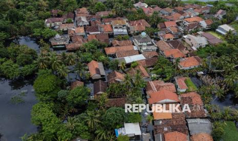 Foto udara kondisi permukiman terdampak banjir di Kampung Kuranji, Desa Cakung, Kabupaten Serang, Banten, Selasa (3/2/2026). Menurut warga setempat, banjir yang melanda permukiman tersebut sudah berlangsung selama 22 hari hingga kini belum surut dan menyebabkan 112 terendam banjir sehingga aktivitas warga terganggu. (FOTO : ANTARA FOTO/Muhammad Bagus Khoirunas)