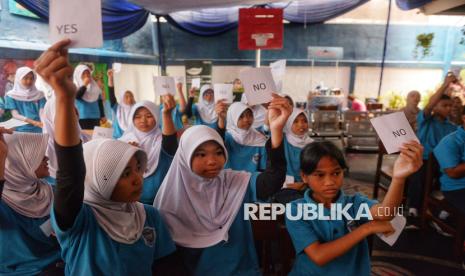 Sejumlah siswa saat mengikuti acara memperingati Hari Gizi Nasional (HGN) 2026 di Sekolah Dasar Negeri (SDN) Manggarai Selatan 01, Jakarta, Rabu (22/1/2026). Puskesmas Tebet menggelar kegiatan edukatif dalam rangka memperingati Hari Gizi Nasional 2026 sebagai upaya meningkatkan kesadaran masyarakat dan siswa akan pentingnya gizi seimbang serta dampaknya terhadap kesehatan jangka panjang. (FOTO : Republika/Prayogi)