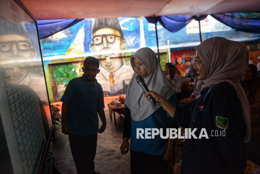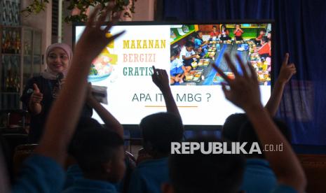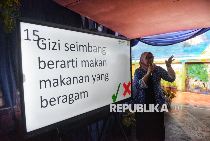 Petugas menyampaikan pertanyaan terkait gizi saat memperingati Hari Gizi Nasional (HGN) 2026 di Sekolah Dasar Negeri (SDN) Manggarai Selatan 01, Jakarta, Rabu (22/1/2026). Puskesmas Tebet menggelar kegiatan edukatif dalam rangka memperingati Hari Gizi Nasional 2026 sebagai upaya meningkatkan kesadaran masyarakat dan siswa akan pentingnya gizi seimbang serta dampaknya terhadap kesehatan jangka panjang. (FOTO : Republika/Prayogi)