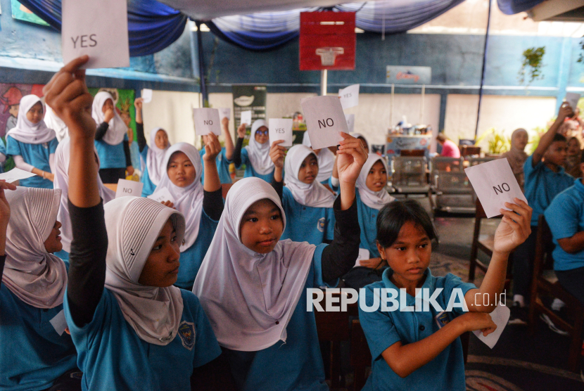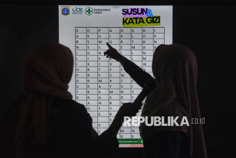 Sejumlah siswa mengikuti permainan edukatif terkait gizi saat memperingati Hari Gizi Nasional (HGN) 2026 di Sekolah Dasar Negeri (SDN) Manggarai Selatan 01, Jakarta, Rabu (22/1/2026). Puskesmas Tebet menggelar kegiatan edukatif dalam rangka memperingati Hari Gizi Nasional 2026 sebagai upaya meningkatkan kesadaran masyarakat dan siswa akan pentingnya gizi seimbang serta dampaknya terhadap kesehatan jangka panjang. (FOTO : Republika/Prayogi)