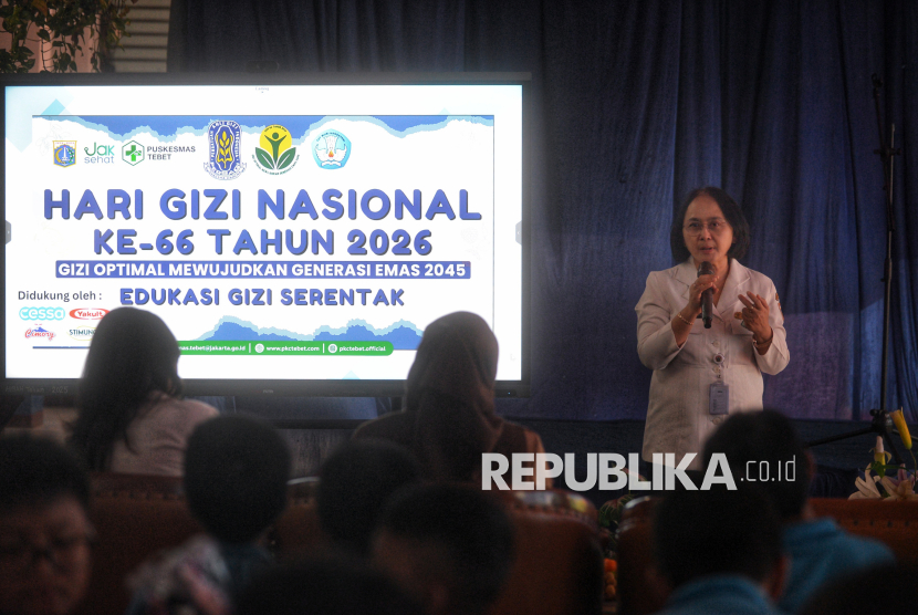 Kepala Puskesmas Tebet drg. Kristiani Dwi Hastuti, MPH memberikan sambutan saat memperingati Hari Gizi Nasional (HGN) 2026 di Sekolah Dasar Negeri (SDN) Manggarai Selatan 01, Jakarta, Rabu (22/1/2026). Puskesmas Tebet menggelar kegiatan edukatif dalam rangka memperingati Hari Gizi Nasional 2026 sebagai upaya meningkatkan kesadaran masyarakat dan siswa akan pentingnya gizi seimbang serta dampaknya terhadap kesehatan jangka panjang. (FOTO : Republika/Prayogi)