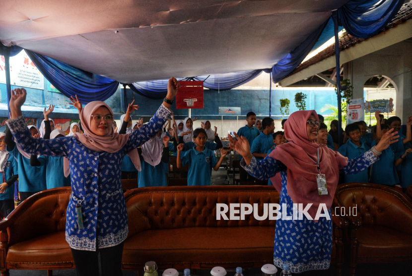 Sejumlah siswa dan petugas melakukan senam gizi seimbang saat memperingati Hari Gizi Nasional (HGN) 2026 di Sekolah Dasar Negeri (SDN) Manggarai Selatan 01, Jakarta, Rabu (22/1/2026). Puskesmas Tebet menggelar kegiatan edukatif dalam rangka memperingati Hari Gizi Nasional 2026 sebagai upaya meningkatkan kesadaran masyarakat dan siswa akan pentingnya gizi seimbang serta dampaknya terhadap kesehatan jangka panjang. (FOTO : Republika/Prayogi)