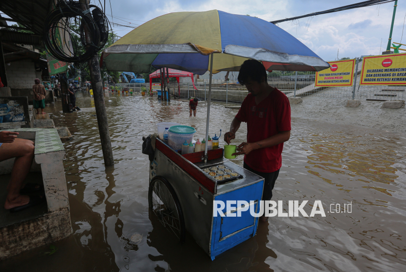 Pedagang berjualan saaTraders sell during the flood in the East Kemang area of RT 03 RW04, South Jakarta, Friday (23/1/2026). The flood, which stood about 120 centimeters, submerged about 20 houses that occurred since Thursday night. Based on Republika (FOTO : Republika/Thoudy Badai)