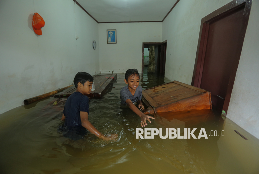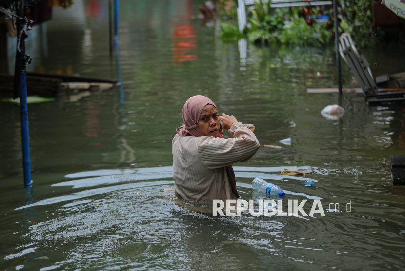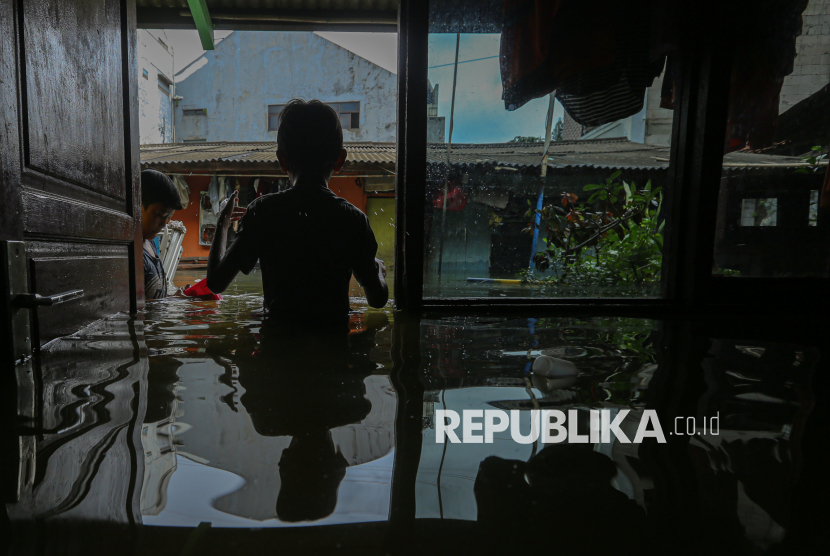 Warga beraktivitas saat banjir merendam permukimannya di kawasan Kemang Timur RT 03 RW04, Jakarta Selatan, Jumat (23/1/2026). Banjir setinggi sekitar 120 centimeter tersebut merendam sebanyak sekitar 20 rumah yang terjadi sejak Kamis (22/1) malam kemarin. Berdasarkan pantauan Republika, selain area permukiman, banjir terjadi di jalan raya Kemang Utara IX dengan ketinggian sekitar 30-40 centimeter. (FOTO : Republika/Thoudy Badai)