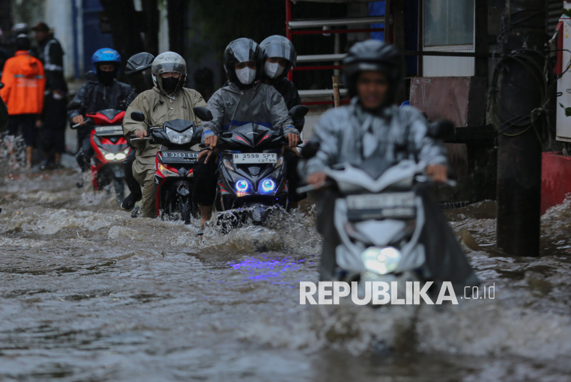Pengendara melintas saat banjir di Kemang Timur RT 03 RW04, Jakarta Selatan, Jumat (23/1/2026). Banjir setinggi sekitar 120 centimeter tersebut merendam sebanyak sekitar 20 rumah yang terjadi sejak Kamis (22/1) malam kemarin. Berdasarkan pantauan Republika, selain area permukiman, banjir terjadi di jalan raya Kemang Utara IX dengan ketinggian sekitar 30-40 centimeter. (FOTO : Republika/Thoudy Badai)