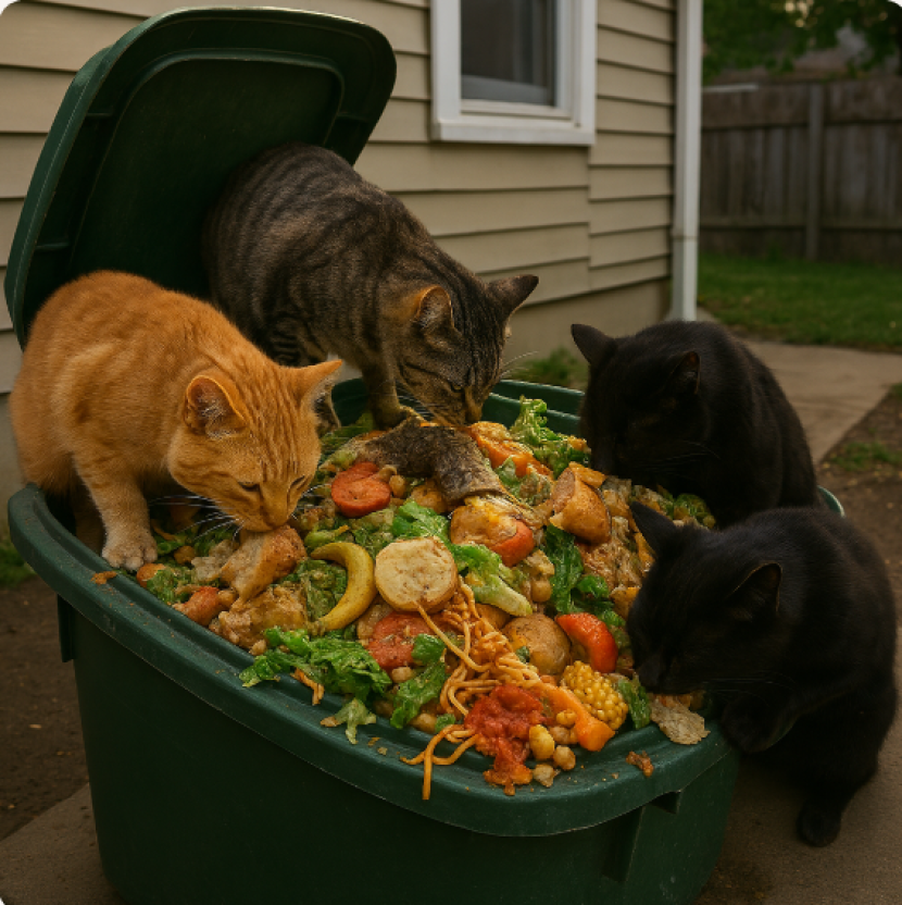 Ilustrasi beberapa kucing sedang menikmati makanan di satu tempat sampah. (Sumber: Copilot)