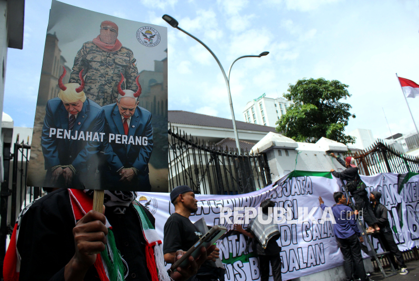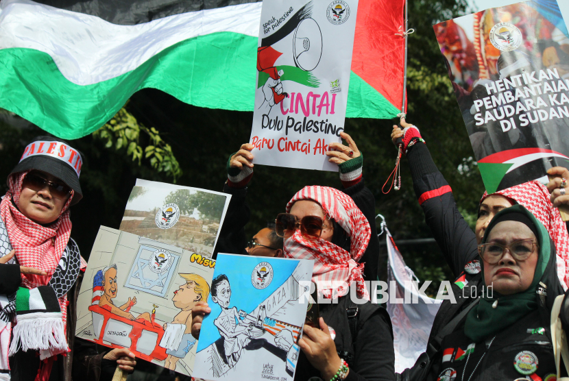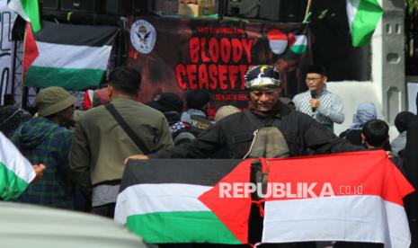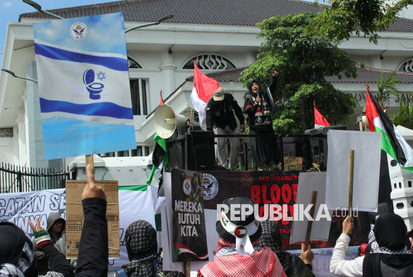 REPUBLIKA.CO.ID, BANDUNG -- Ratusan massa dari Aliansi Bela Palestina Boikot Israel (Ababil) menggelar aksi Peduli Palestina bertajuk Gencatan Senjata Berdarah di depan Gedung DPRD Jawa Barat, Jalan Diponegoro, Kota Bandung, Jumat (13/2/2026).