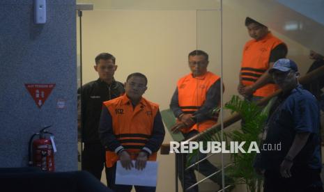 Bupati Pati Sudewo bersama tersangka lainnya mengenakan rompi tahanan usai menjalani pemeriksaan terkait Operasi Tangkap Tangan (OTT) di Gedung Merah Putih KPK, Jakarta, Selasa (21/1/2026). KPK menahan sejumlah tersangka yakni Bupati Pati Sudewo, Abdul Suyono Kades Karangrowo, Sumarjiono Kades Arumanis serta Karjan Kades Sukorukun. (FOTO : Republika/Prayogi)