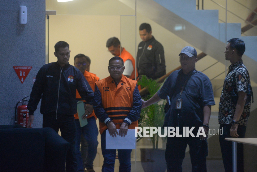 Bupati Pati Sudewo menggunakan rompi tahanan usai menjalani pemeriksaan terkait Operasi Tangkap Tangan (OTT) di Gedung Merah Putih KPK, Jakarta, Selasa (21/1/2026). Bupati Pati Sudewo resmi ditahan KPK terkait dugaan kasus pemerasan dalam pengisian jabatan perangkat desa di lingkungan Pemerintahan Kabupaten Pati. (FOTO : Republika/Prayogi)